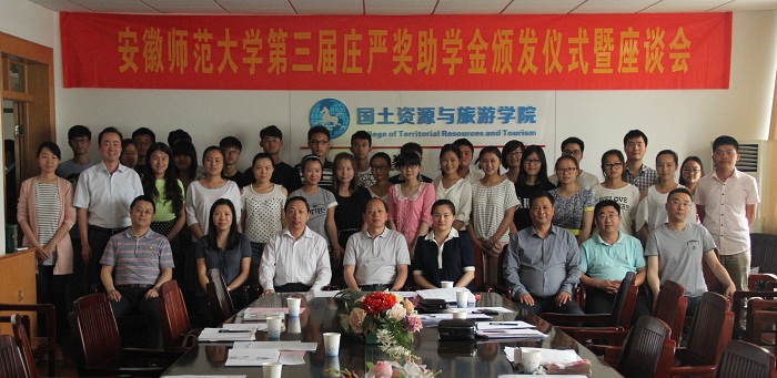 第三届庄严奖助学金颁发大会暨座谈会在国旅学院行政楼三楼会议室隆重举行。院长焦华富、院党委副书记乔静、庄严基金会代表、国旅学院全体专兼职辅导员及获奖受助学生参加了本次大会。会议由乔静主持。