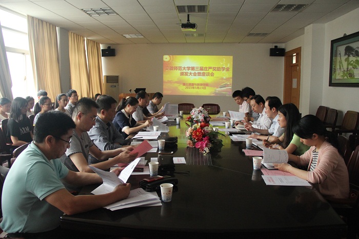 设立情况和2015年的评审工作。四名本届奖助学金获得者代表向基金会代表汇报了自己受资助的体会和在思想、学习、生活以及志愿服务、奉献社会等方面的表现,对基金会的关爱和帮助表示感谢。2013级旅游管理专业的钱美玲同学表示:“奋发图强、饮水思源是一名当代大学生应有的品质,自己在勤奋学习、以优异成绩回馈母校的同时,也一定会将庄严基金会的爱心善举传承下去,造福他人、感恩社会、报效祖国。”庄严基金会评审委员会主任庄明福先生、基金会代表吴斌先生也分别对获奖助学金的同学表示了祝贺,希望他们再接再厉、勇攀高峰。