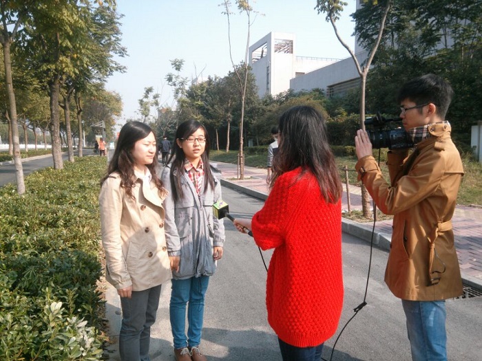 当日早晨,在学校西大门,来自国旅学院2013级土地资源管理专业的5位女生,在芜湖市电视台记者的指导下,认真了解了节目的制作流程及技巧,共同摄制完成了三组关于私家车司机问路的视频。
