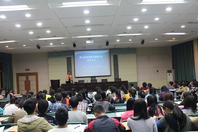会上,杨效忠老师说明此次实习任务从历年的皖南旅游资源调研转变为旅游目的地调研,介绍了实习的任务与安排,并且鼓励学生们在实习中要多看、多听、多问、多想。苏勤院长强调了实习的重要性,叮嘱同学们要做好充分的准备工作,加强旅途安全防范,做好山上防寒工作。罗振书记结合两位老师的发言对同学们此次的皖南实习寄托了诚挚的祝福,希望大家将理论知识与专业实习相结合,同心协力,排除万难,满载而归。最后王群老师为同学们介绍了黄山旅游资源分布、旅游文化底蕴与旅游经济发展等状况,使同学们对此次实习目的地有了一个更加广泛而深刻的了解。