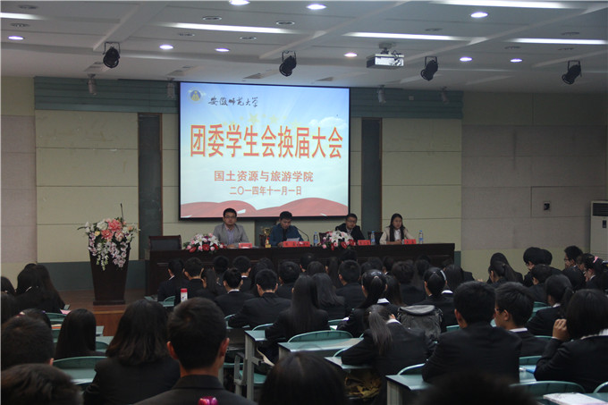 大会在激情昂扬的团歌声中拉开了帷幕。首先进行的是学生会换届大会。学生会指导老师、2013级辅导员陈健郑重地宣读了新一届团委学生会干部名单后,新任团委学生副书记、2012级地理科学专业盛婷进行了述职报告,并与大家分享自己的工作经验和心得体会,并对团学工作新成员寄予了厚望。新任学生会主席团代表、2013级地理科学专业张天然也上台发言,表明新一届团委学生会全体学生干部为同学服务的决心,同时对团委老师的悉心教导表示了由衷的感谢。最后,团委书记张鑫进行总结发言,高度赞扬了过去一年学院在奖学金、团委工作、暑期社会实践、校运会及专业竞赛等方面的取得的成绩,并与上届学生干部颁发聘书合影留念。