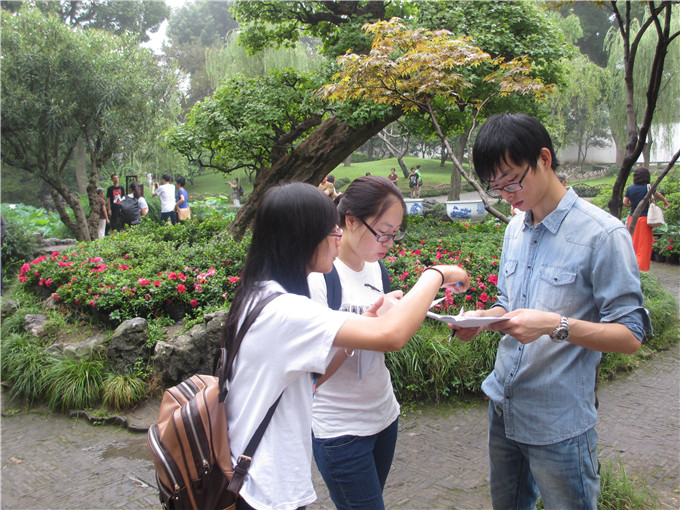 在游览的过程中,队员们一边对各种植物景观、园林设计进行考察和拍照,一边向游客发放调查问卷,询问他们对于苏州园林保护与绿化的一些了解和看法。在调研的前几天,碰巧赶上了苏州的梅雨天,游客们手中几乎都带着雨伞,都不怎么方便,这也增加了我们调研的难度。但队员们实践的热情并没有被连绵的大雨浇灭,努力克服着天气不便带来的种种困难,选在游客闲暇休息的时候再发放问卷,和他们亲切交谈,了解游客心中的苏州园林。在调查的过程中,队员们还遇到了一些在园林中写生的大学生,在与他们的交谈中,了解了许多关于园林设计的知识。