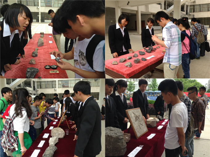 此次化石展通过多种方式对巢湖实习进行了全方位的介绍与宣传。一方面,为了铭记此次巢湖实习,同时使宣传效果达到最佳,13级地理科学赵奎同学以整个实习为内容制作了视频,并且通过在大学生活动中心的LED显示屏上播放此视频,向全校同学展示此次巢湖实习的专业性和趣味性;另一方面,身着黑色西服的地科同学详细的介绍和讲解,丰富了前来驻足欣赏请教的同学的地质学知识,也增长了他们的见识;此外,通过制作展板展示同学们在实习时学习、实地考察、绘图、日常生活的照片的方式,更好地展现了地科专业学子的青春靓丽,风采无限;一旁还有专门设立的地理相关知识的有奖竞答环节。