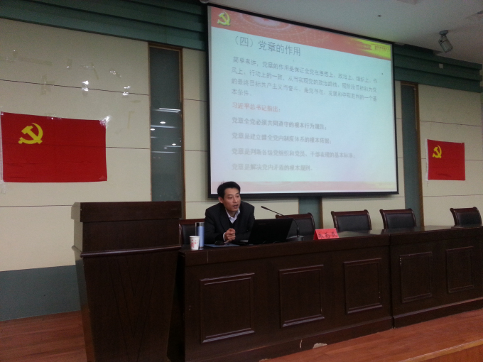 在实验楼101教室进行了学生党员教育培训班党课学习的第二讲,特别邀请了校党委组织部部长毕明福、副部长朱为民为学生党员授课。