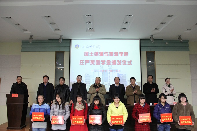 本网讯(院记者团)12月20日下午,我校第二届(2013-2014学年)庄严奖、助学金颁发仪式在国旅学院实验楼101报告厅隆重举行。庄严基金会代表、学生处副处长陈莉、院领导班子成员,学院全体辅导员及受奖、助学生代表参与了此次颁发仪式。大会由国旅学院党委副书记罗振主持。