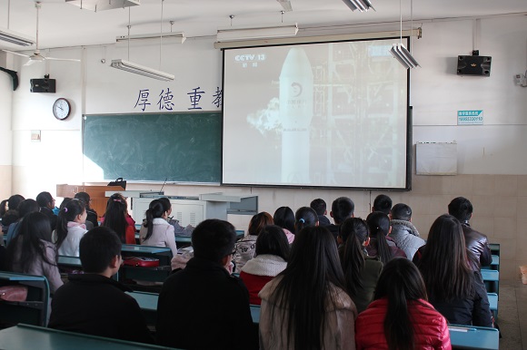 今日凌晨1时30分,搭载着嫦娥三号的长征三号乙运载火箭点火发射,顺利升空。为见证这一历史时刻,感受伟大祖国的繁荣昌盛,国旅学院组织在校师生集体观看了发射实况转播。