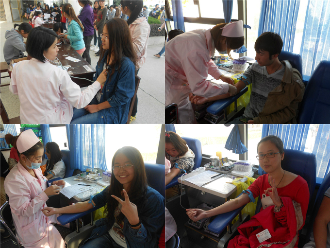 从中午12点半开始,同学们就或自发或以班级为单位陆续来到献血点,在院学生会志愿者的指引下有序参加登记填表、体检、化验与献血。此次活动得到了13级新生大力支持,不少同学都是第一次参加献血,许多女生也勇敢的加入到献血队伍中来,为奉献爱心尽自己的一份力量。来自13级地理信息科学专业的方正同学与13级地理科学专业的汪春云同学在接受电视台采访时就表示:虽然比较害怕,但是一想到为社会做贡献,就感到非常骄傲。