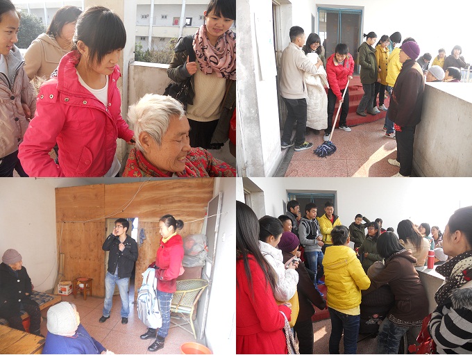 随后,同学们各自有序地忙了起来:有的为老人们收拾衣物卫生,有的人陪老人们聊天,有的帮忙在院里清理环境,有的唱歌,有的帮老人按摩,还有同学弯下腰亲自替老人剪脚趾甲.这一幕幕让在场的所有人无不动容,爷爷奶奶们也开心得合不拢嘴,直说:“你们学生好啊,你们学生好啊!”各志愿者们也是无比的开心。