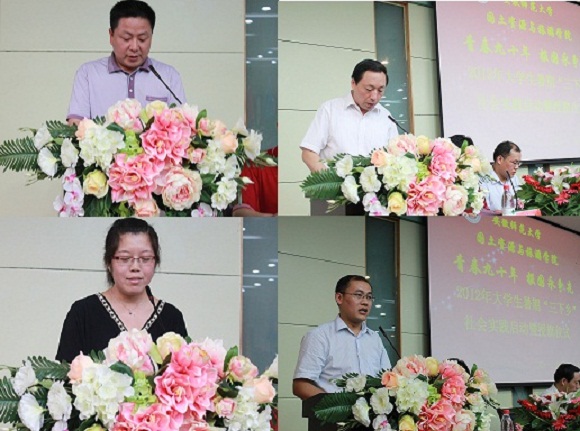 “青春九十年,报国永争先”。6月29日下午,国旅学院在实验楼101教室召开2012年大学生暑期“三下乡”社会实践活动动员大会暨启动授旗仪式。校党委学工部部长、学生处处长台启权、校团委组织部部长胡悦超、学院暑期社会实践团队思政指导老师牛菲,国旅学院全体领导班子成员出席了大会,所有团队指导老师及队员参加了启动仪式。会议由国旅学院团委副书记张鑫主持。