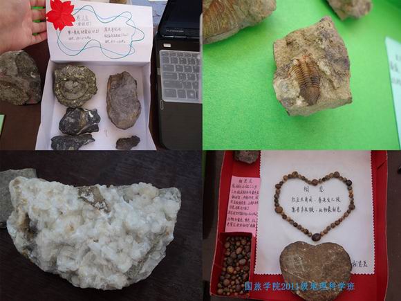 本次实习成果展上化石均为2011级地理科学专业同学,5月上旬于巢湖野外实习采集采集所得。在为期一周的野外实习期间,同学们或冒着细雨,或顶着骄阳,在崎岖的山林石壁间穿梭,测产状,拉剖面,敲化石……成果收集包括三叶虫化石、贝壳化石、珊瑚化石、菊石化石等珍贵化石,以及愚人金、方解石等岩石标本。