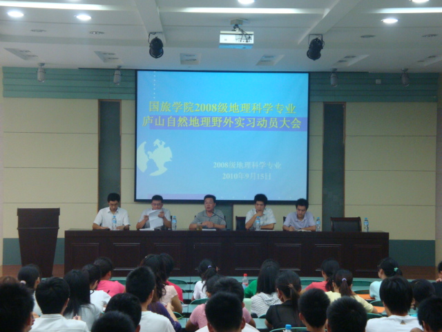 9月15日下午,国旅学院在该院实验楼101教室举行了2008级地理专业庐山自然地理野外实习动员大会。学院领导、实习指导老师、辅导员老师和2008级地理专业全体同学出席了大会。