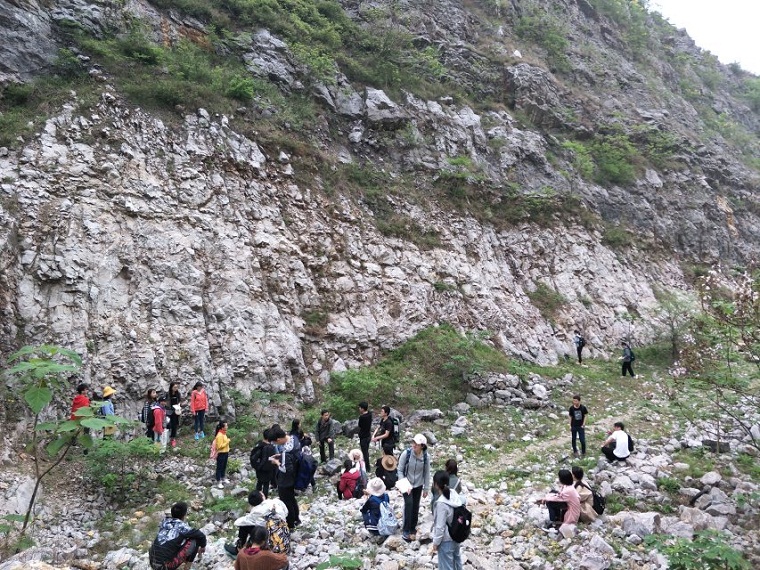 4月23日的实习任务是认识裸岩的地物类型以及进行林地类型的解译等。相同的地点却有着不一样的体验。程先富老师在石坑外介绍了此次采石坑的地质历史背景,以及石坑外部的岩石类型及主要成分。跟着老师深入采石坑中,同学们了解了采石坑中栖霞组,和州组,黄龙组,船山组四种不同的岩石类型。