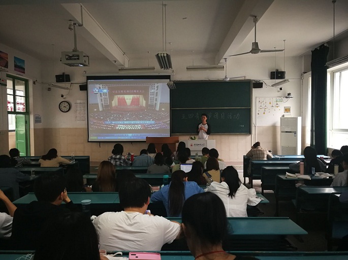 活动现场,首先由团支书周子航带领全体同学观看习近平总书记在纪念五四运动100周年大会上发表的重要讲话,鼓励新时代青年树立远大理想,志存高远,激发奋进潜力,正所谓“立志而圣则圣矣,立志而贤则贤矣”,讲话中习近平总书记要求当代青年将自己的小我融入祖国的大我、人民的大我之中,与时代同步伐,与人民同命运,才能更好实现人生价值,升华人生境界,令同学们受益匪浅。活动第二阶段,由同学们推选出的优秀青年代表张萌同学,带领同学们朗诵经典诗歌《青春中国》,诗歌字里行间,讲述中国历经的风风雨雨,歌颂五四的爱国青年觉醒,让同学们感受到青年在祖国有弱而强历程中发挥的巨大作用,以勉励自我去传承五四精神,追逐青春梦想,在奋斗中释放青春激情,用自己的力量为祖国为人民、为中华民族伟大复兴贡献青年力量。最后,由胡文晓代表全体同学分享了自己的活动感悟与启示,胡文晓同学表示作为当代大学生应展现新时代青年的精神风貌,传承五四精神的薪火,肩负历史使命,矢志投身新时代、拥抱新时代、奋斗新时代。活动在同学们热烈的掌声中结束。