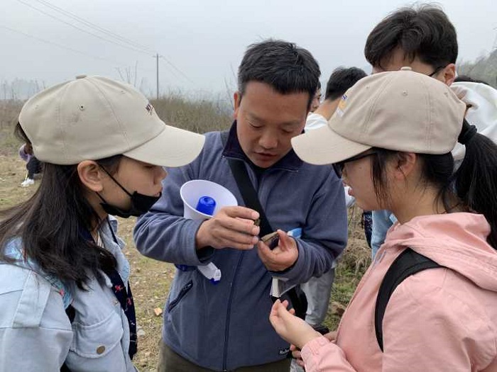 在为期一周的实习中,学生们观察了一块岩体,探寻了两个溶洞,了解了三个褶曲,遇到了五条断层,测量了七个地层,翻越了八座山峰。带队老师程先富、杨立辉、吴立耐心地向同学们讲解实习期间三十个地质观察点的相关地理知识。从巨嶂山、麒麟山、平顶山到紫微洞、王乔洞,再到巢湖湖滨,师生们携手同行,用一把地质锤,一个地质罗盘,一面放大镜,辨识岩层的层位、岩性,分析溶洞、巢湖的成因,寻找生物化石。