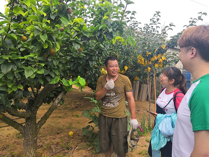 “城市田园交响曲”团队成员分别前往项目合作农户李培荣、臧立成家进行梨园梨果生长情况考察,并邀请技术农户李培松讲解梨果生长条件。团队成员了解到砀山梨从授粉、疏果、成果、虫害防治、肥料补充等均采用纯天然原生态种植方式,确保梨果的高质量高品质。