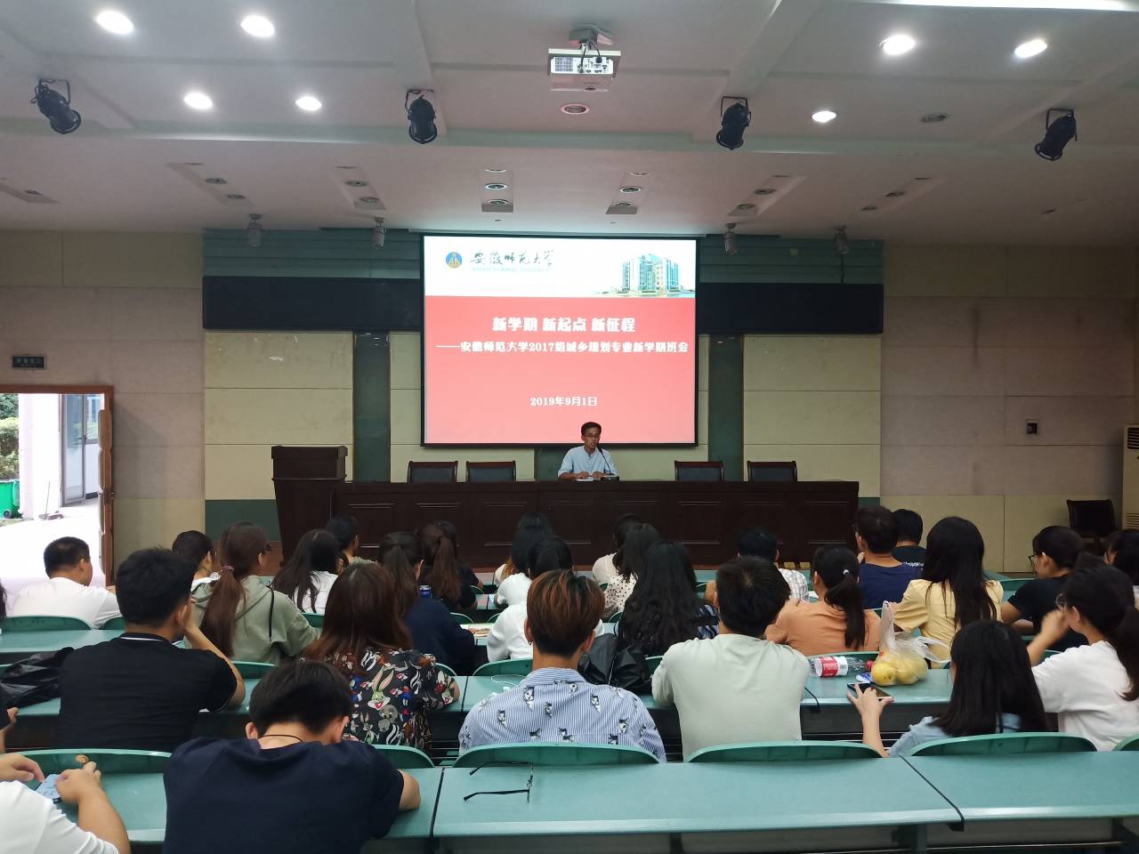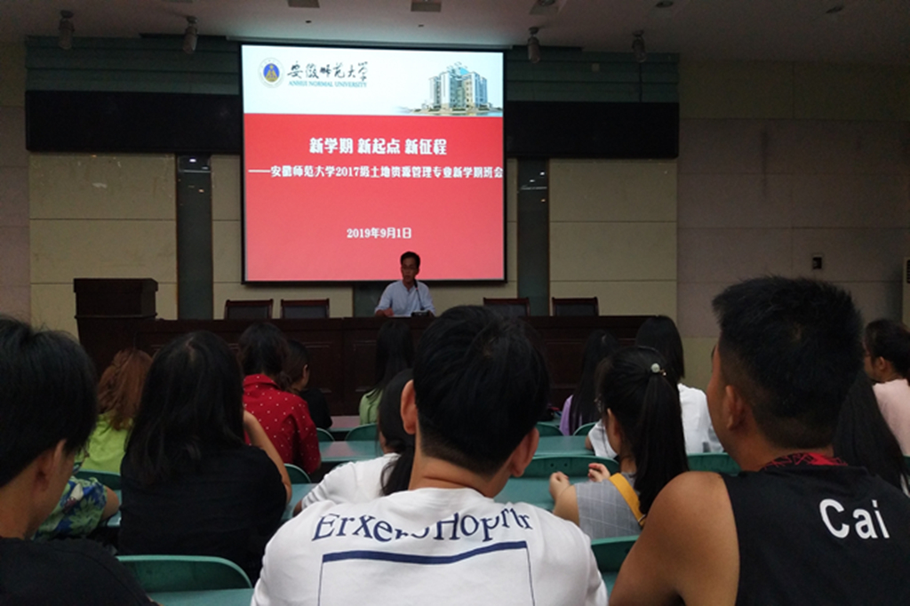 实验楼101报告厅召开了主题为“新学期 新起点 新征程”的新学期班会。班会由辅导员齐小学主持,2017级城乡规划、土地资源管理专业全体同学参加会议。