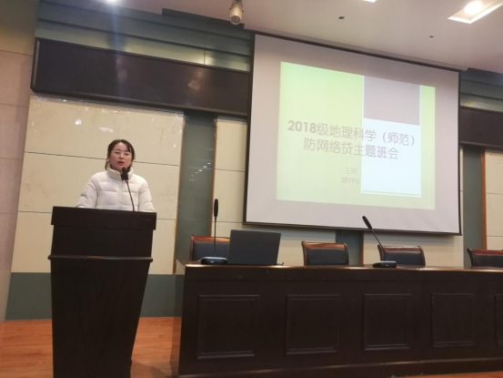 本网讯(王阳 罗文菁)为了倡导学生抵制不良消费,远离网络贷,2018级地理科学师范班11月19日晚于实验楼101报告厅召开关于“抵制不良消费,远离网络贷”主题班会。会议由辅导员王阳主持,2018级地理师范班全体成员参加。