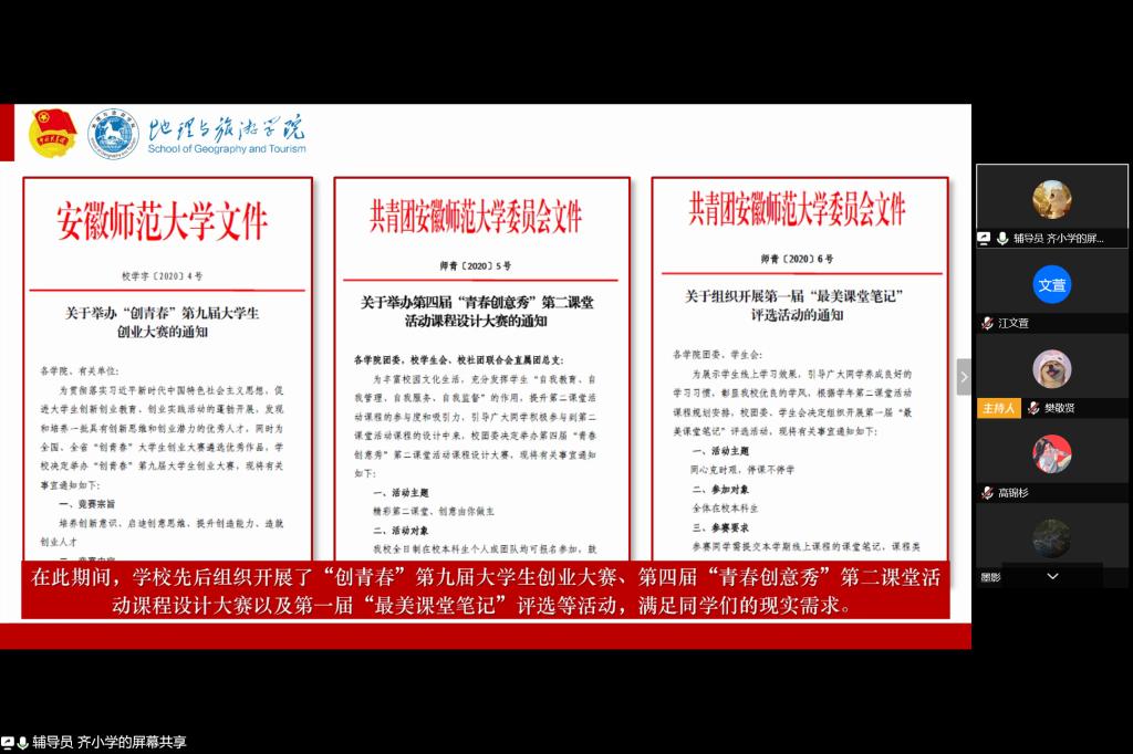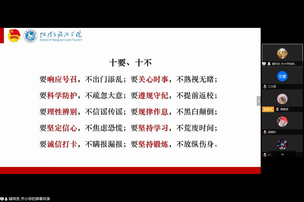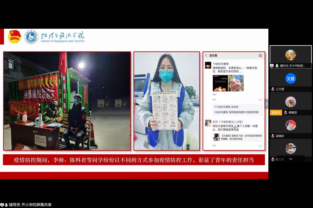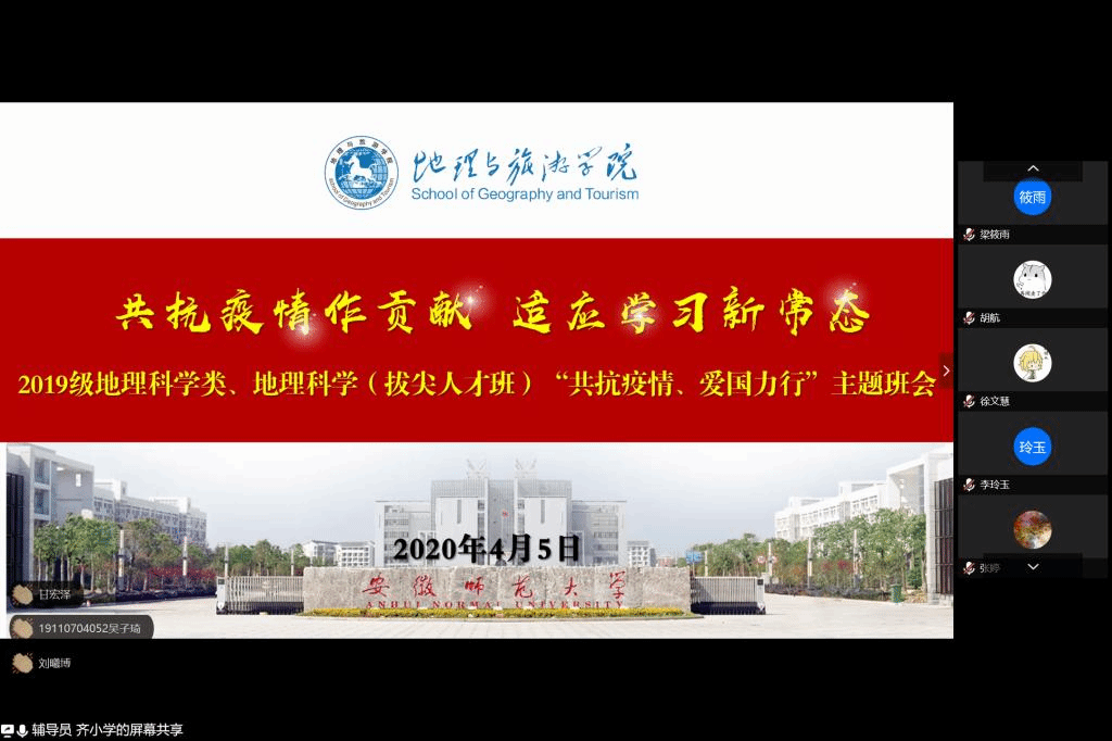 高诗涵 齐小学)为贯彻落实疫情防控工作最新通知和学校线上教学相关要求,教育引导同学们适应线上教学新常态。4月5日晚,2019级地理科学大类积极运用腾讯会议网络平台组织召开了“共抗疫情、爱国力行”网络主题班会。2019级地理科学类、地理科学(拔尖人才班)全体同学参加班会。班会由辅导员齐小学主持。