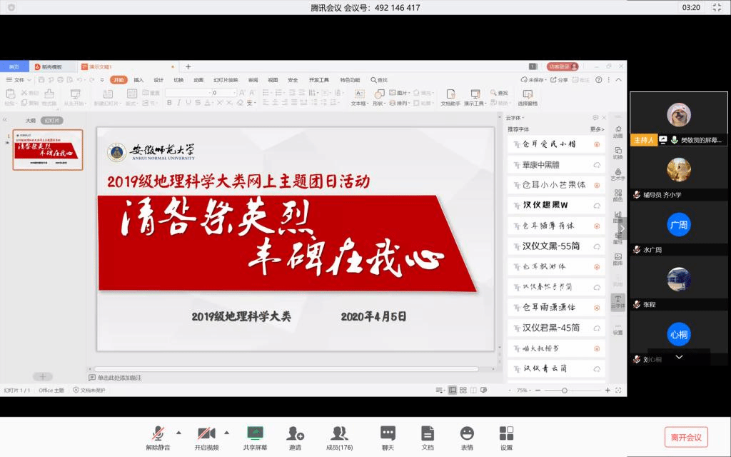 武诺 齐小学)为纪念抗疫牺牲烈士和逝世同胞,学习和发扬伟大抗疫精神。4月5日晚,2019级地理科学大类利用腾讯会议网络平台举行了“清明祭英烈、丰碑在我心”网上主题团日活动。2019级地理科学大类专业辅导员齐小学应邀出席活动。2019级地理科学(拔尖人才班)、地理科学类1班和地理科学类2班全体学生参加活动。活动由2019级地理科学(拔尖人才班)班长樊敬贤主持。