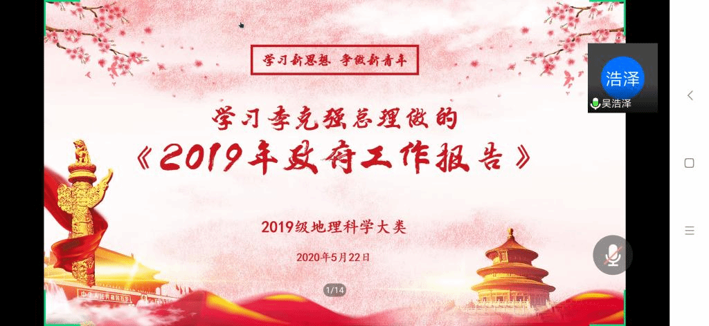 武诺 齐小学)5月22日晚上,2019级地理科学大类利用腾讯会议网络平台举行李克强总理政府工作报告的专题学习会议。2019级地理科学(拔尖人才班)、地理科学类1班、2班全体学生干部参加学习会。学习会由2019级地理科学类2班团支书吴浩泽主持。