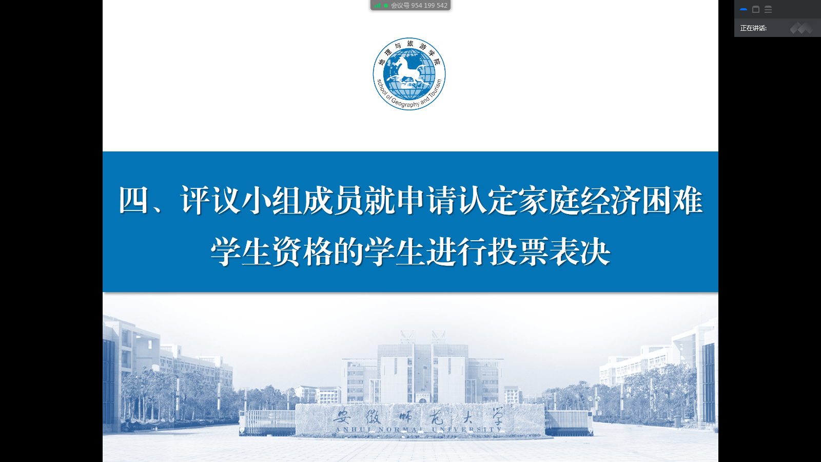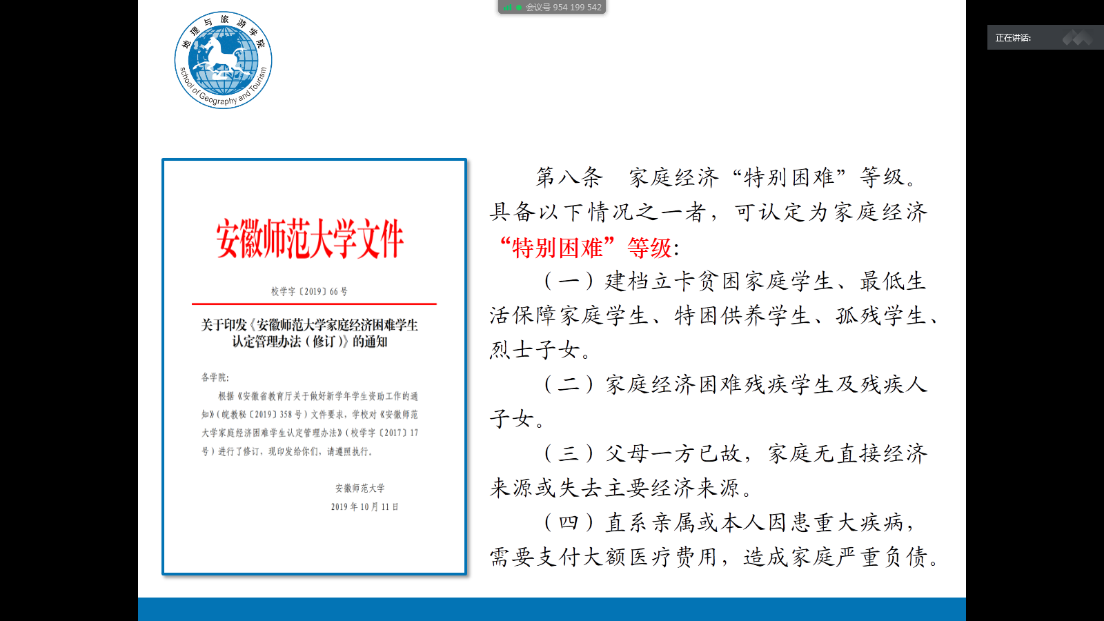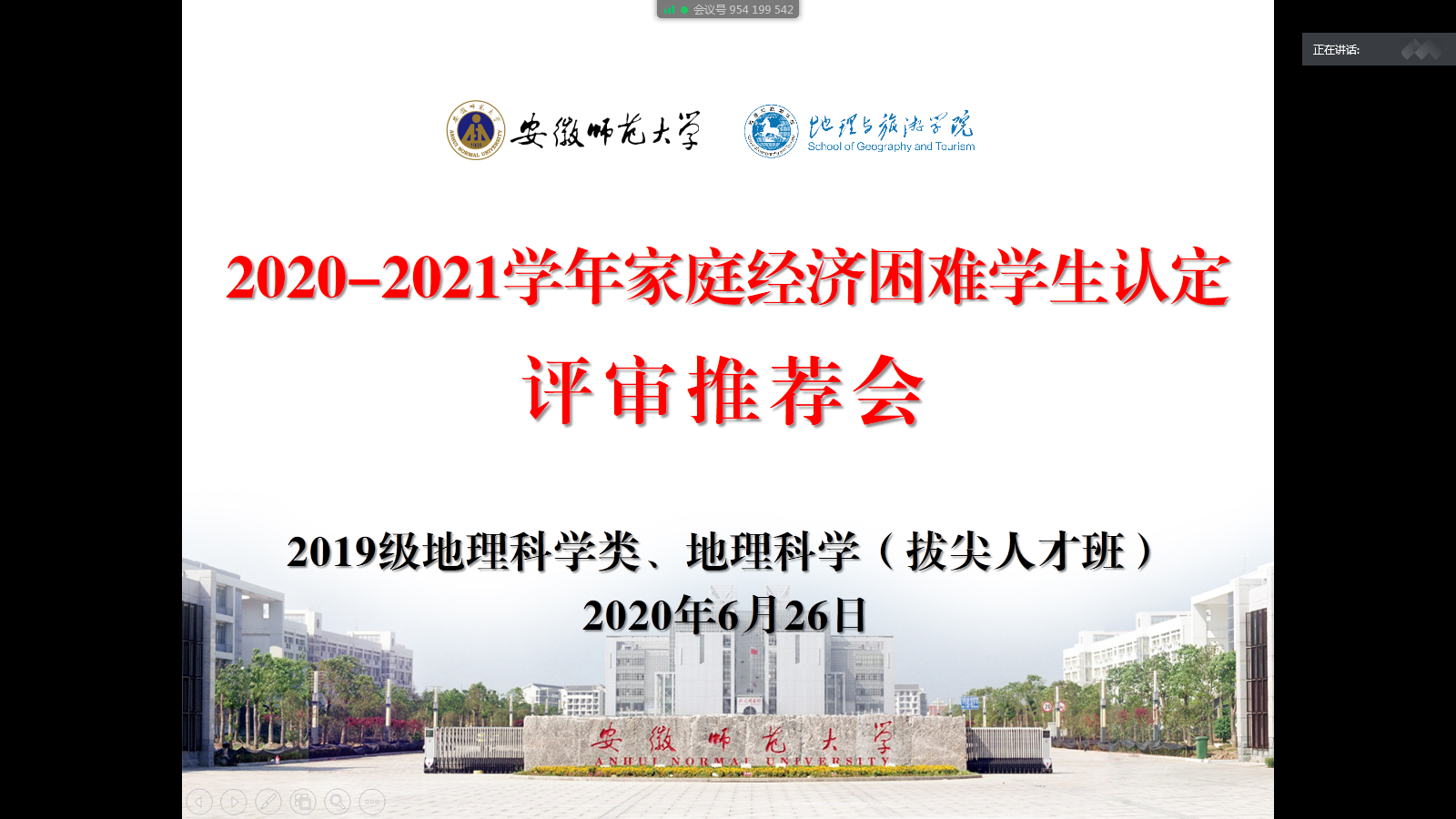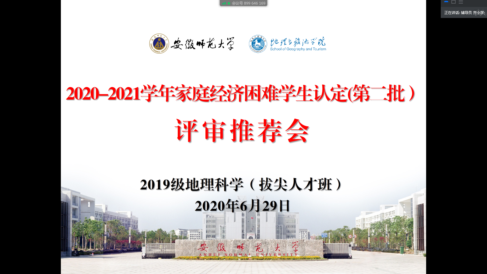 齐小学)为贯彻落实学校大学生资助政策,认真做好家庭经济困难学生资助工作,公平、公正、合理配置资助资源,精准资助家庭经济困难学生。6月26日、29日,2019级地理科学类1班、2班和2019级地理科学(拔尖人才班)召开2020-2021学年家庭经济困难学生认定评审推荐会,各班级认定评议小组全体成员参加会议。会议由认定评议小组组长、辅导员齐小学主持。