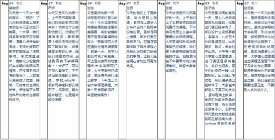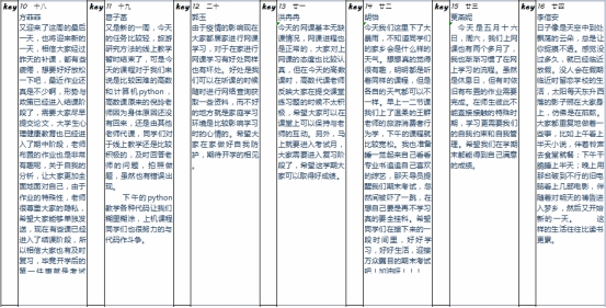 “班级云日志”由全班同学共同配合完成,素质拓展委员姚旭负责收集整理,“班级云日志”分享了同学们对线上学习、线上活动以及疫情生活的体会感悟,每位同学都积极主动完成每天的日志任务。