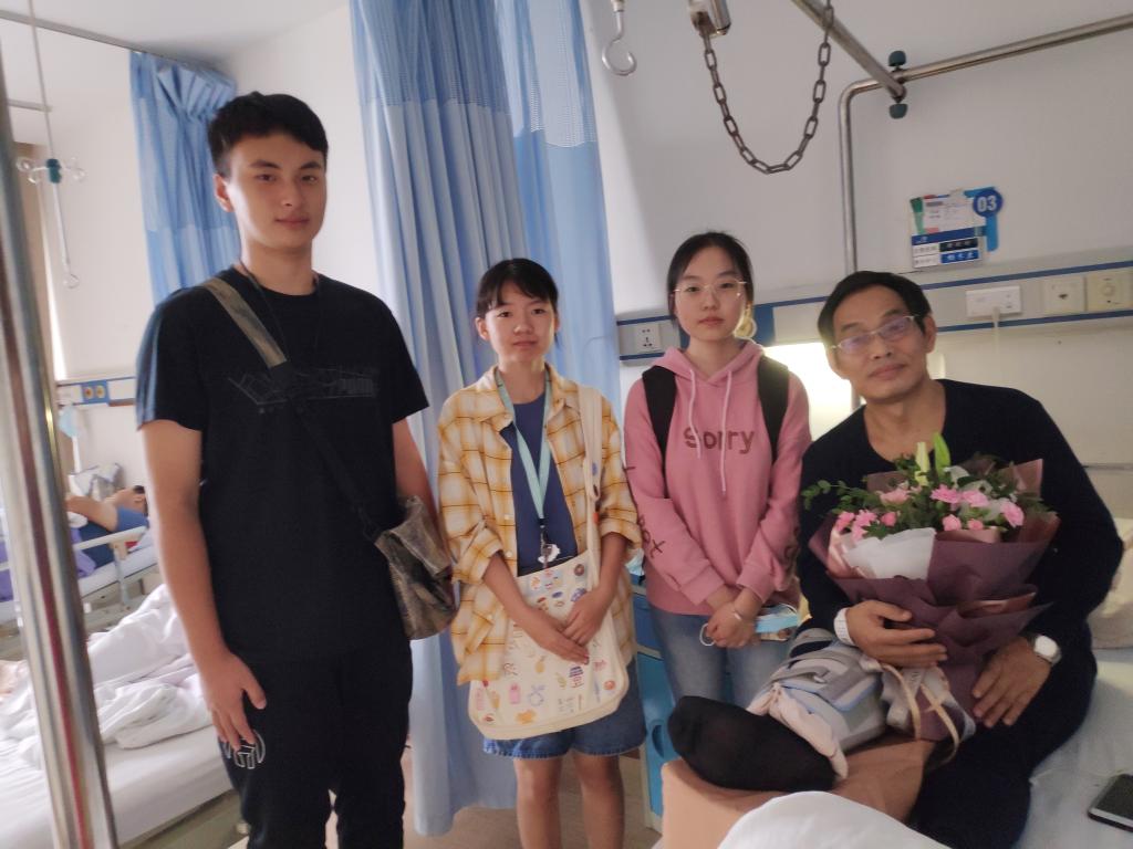 李娜)9月16日晚,孙叶根老师从院实验楼实验室准备实习用品后骑电瓶车返家途中,因下雨路滑电瓶车侧翻,致右膝下髁间棘骨折及右腿胫骨平台骨折,18地科非师范班同学得知消息后,自发组织派学生代表冯安兰、李娜、杜昊宇前往医院探望老师。