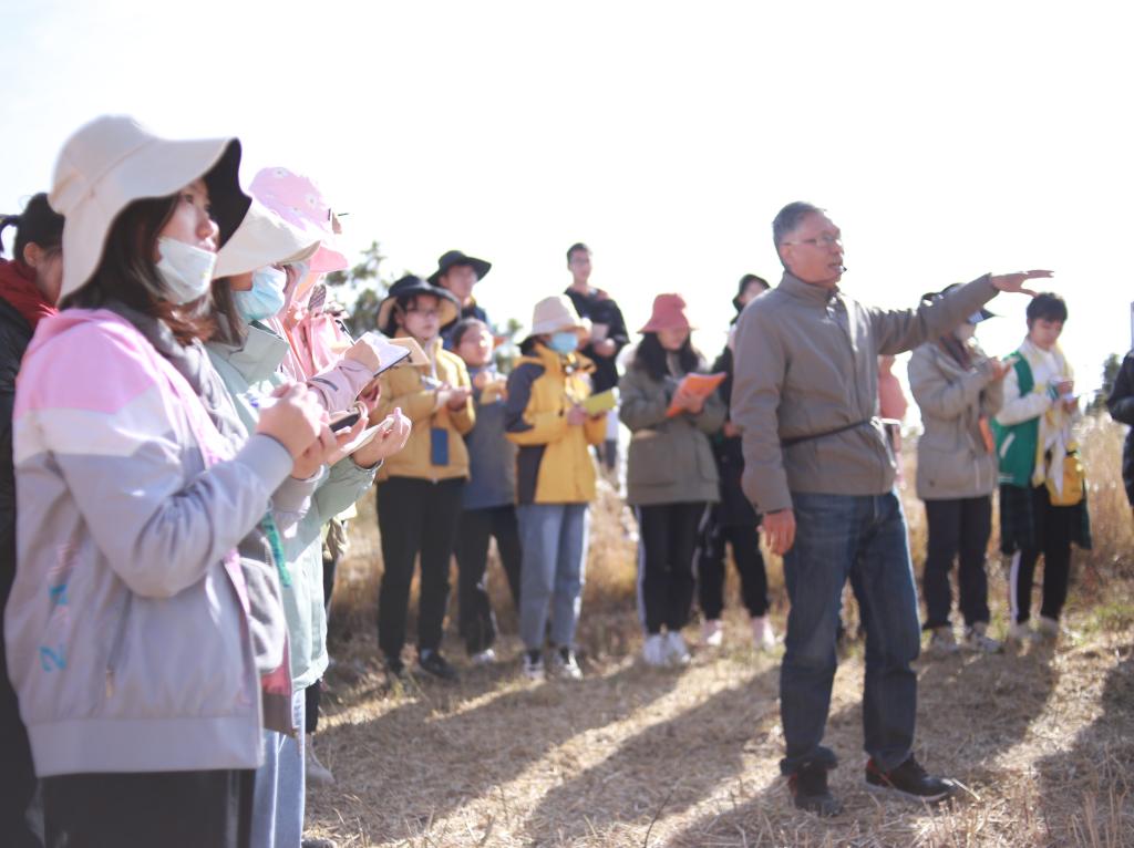 讲解完之后,同学们又自由分散开来观察地貌,最后大家在七彩仙缘台围绕着校旗、院旗和班旗进行了集体合照。通过野外的考察大家将书本上的知识与地理实际景观相对应,加强了野外实践考察能力和对书本知识的理解、运用。