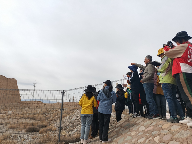 关山南北共争雄,云压缭垣雪压峰。10月13日清晨,团队全体成员随带队老师一同自甘肃张掖出发前往有着“天下第一雄关”之称的嘉峪关,并于中午时分顺利抵达目的地。此行团队选择了嘉峪关最南端的一座墩台作为主要考察对象,据领队老师程先富详细讲解,嘉峪关天下第一墩地处戈壁荒漠,其植被多丛生、矮小、耐旱,原为河湖海洋,后青藏高原隆起,使得该地的水和大气条件变化,逐渐发展为戈壁。同时程先富也鼓励同学们结合人文地理相关知识思考,对该地的地理环境综合分析考察。结合历史知识,同学们了解到该处古长城以土夯实而成,同时掺杂砾石等原料加固,最初的建造目的是为了抵御外敌。