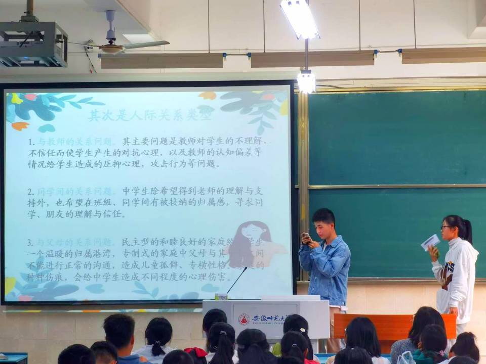 细品心理健康,完善美好生活。活动辗转进入问题互动环节,同学们积极交流各自在日常生活中遇到的问题和困惑,紧接着主持人又详细的向我们介绍其中的学习类问题和人际关系问题,在人际关系问题中从“个人与教师、同学、父母间关系”进行细致讲解,同学们纷纷表示对这些问题有了一个更加清晰的认知。