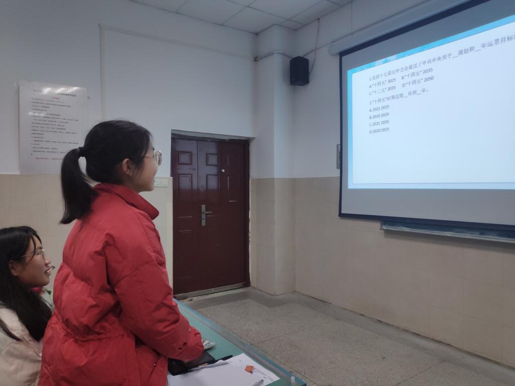活动伊始,团支书韩雨彤介绍了十九届五中全会主要议程,带领同学们深入学习了十九届五中全会指导思想、总体目标及工作要求,并号召班级同学在生活实践中深入领会、切实贯彻十九届五中全会思想精神。为巩固学习成果,团支书韩雨彤组织开展相关知识竞答活动,同学们积极举手发言,现场气氛活跃。随后,大家齐声朗读党的十九届五中全会提出的“四个全面”战略布局新表述、“十四五”规划和2035年远景目标的实现条件等重点知识。辅导员张慧总结道:“身为新时代青年,你们不仅要认真学习专业知识、提升综合能力,更要注重汲取思想养分,积极学习十九届五中全会思想精神和习近平总书记考察安徽重要讲话指示精神等,这将有助于你们找准定位、把握时机,更加全面的发展自己,成为一个对国家、对社会有用的人!”