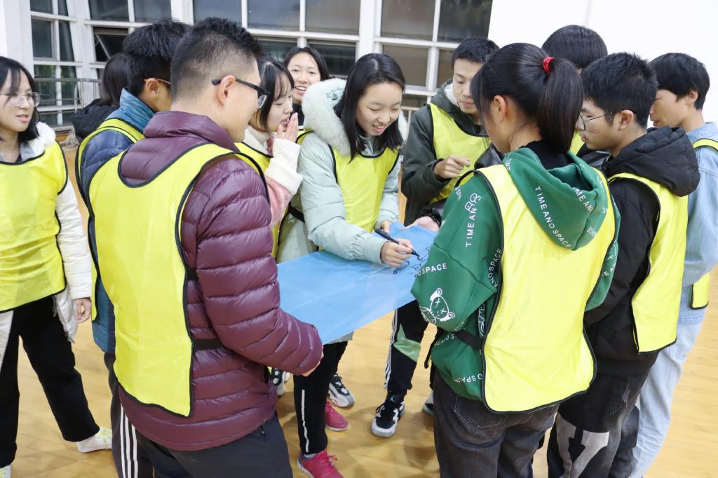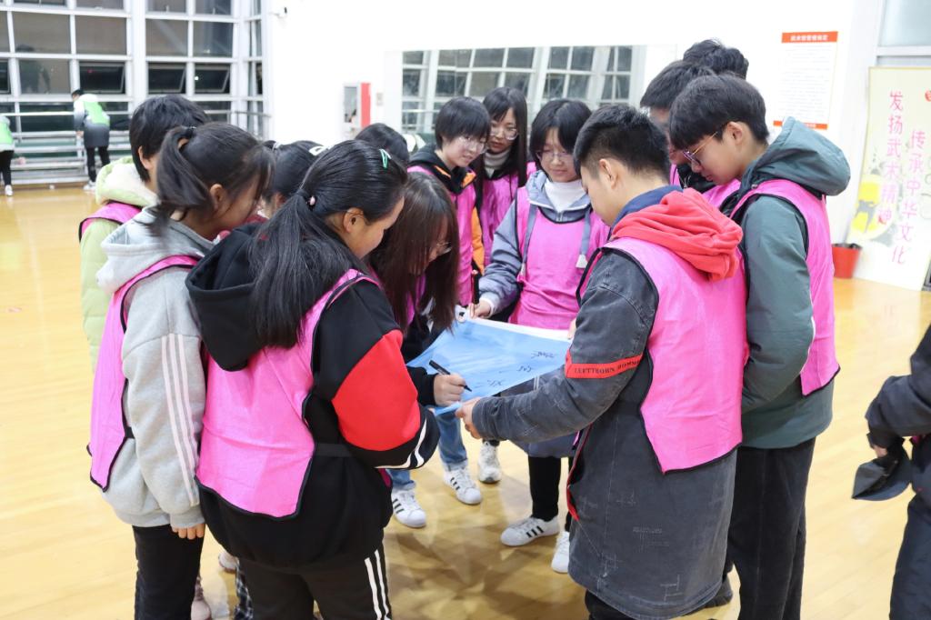 活动期间教练带领同学们进行了几项破冰活动。在活动开始,面对拘束的场面,同学们共同伸出友谊之手,成功地活跃起了本次活动的氛围。接下来进行的便是本次团日活动的重头戏,同学们随机分为六组,分别进行小组建设——设计组名、组旗、组歌、队形和口号。在这样的活动中,每一小组都集思广益,展现了每一位成员的个人能力,发挥每一个人的特长,最后呈现出精彩的结果,迎来热烈掌声。日常生活中不甚熟悉的人因共同的目标相聚,在完成任务的过程中熟稔起来,欢声笑语回荡在整个场馆。分组任务,是一次团队考验,也是一次培养团队感情、增进凝聚力和集体荣誉感的宝贵机会。