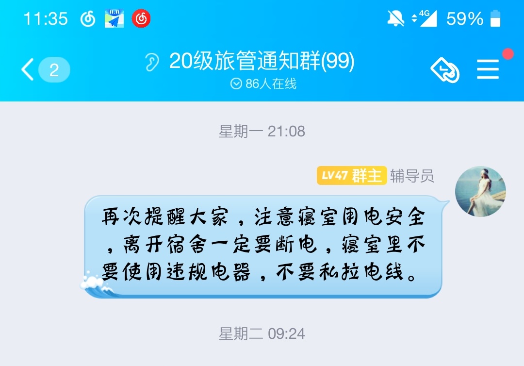 积极落实“零点”汇报制度,各年级各专业以班级为单位,寝室长为监督负责人,每晚23:00辅导员通过“今日校园”了解学生在寝情况,及时掌握学生晚归不归或等情况。为切实加强20级旅游管理专业学生就业安全教育,赵佳慧通过事务性班会、QQ群通知等提醒大家注意冬季寝室用电防火安全及寝室卫生。色情动漫
