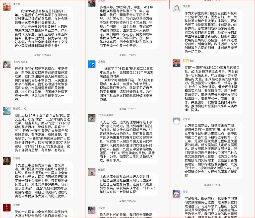 班级组织开展线下线上相结合交流研讨活动,同学们纷纷发表学习心得。刘诗捷说“我们要高举习近平新时代中国特色社会主义思想的伟大旗帜,准确立足于新发展阶段的实际需求,贯彻落实新发展理念,加快构建新发展格局,以‘十四五’规划为具体指导方向,开启全面建设社会主义现代化国家的新征程。”李正妍说,“习近平总书记强调要把个人的理想追求融入党和国家事业之中,作为新时代大学生,应该扎根中国大地,努力学习、练好本领,为夺取全面建设社会主义现代化国家新胜利贡献青春力量!”