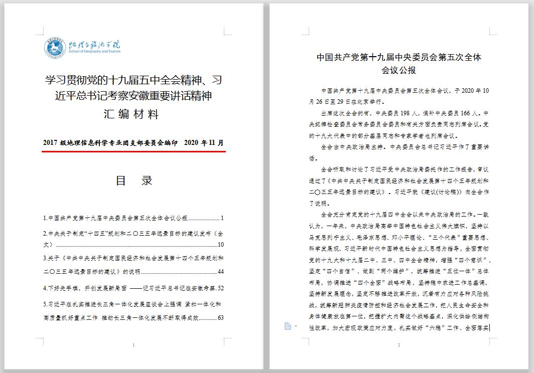 在辅导员韩红豆指导下,2017级地理信息科学专业团支部委员会整理汇编了《学习贯彻党的十九届五中全会精神、习近平总书记考察安徽重要讲话精神》专题学习材料,分发给班级同学参考学习,在班级营造了良好的学习氛围。