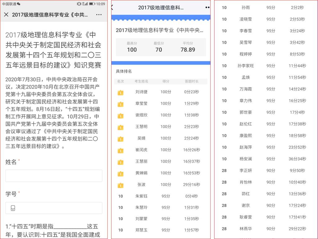 在班级团支书谢煜欣组织下,开展了以学习《中共中央关于制定国民经济和社会发展第十四个五年规划和二〇三五年远景目标的建议》为主题的线上知识竞赛。竞赛发布不久,同学们积极完成了竞赛,多数同学取得了90分以上的好成绩,其中也有不少同学取得了满分的的优异成绩。
