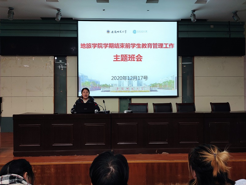 学期结束前学生教育管理工作主题班会在学院实验楼101报告厅举行。2017级地理科学、旅游管理、土地资源管理及酒店管理专业全体同学参加,辅导员王美主持会议。
