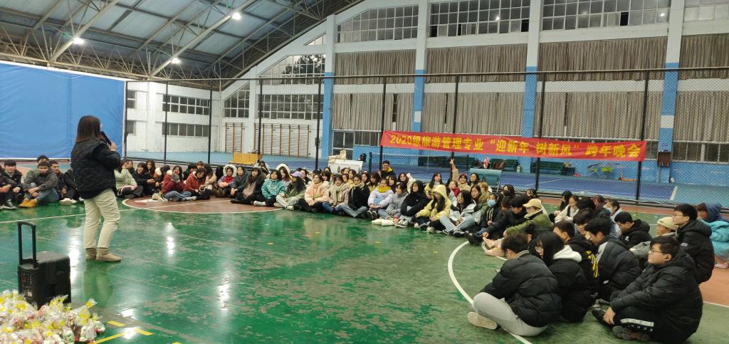 2020级旅游管理专业学生于12月31日晚上7点在花津校区南体育馆举办“迎新年 树新风”跨年晚会。晚会由辅导员赵佳慧带领全体班委组织筹备,2020级旅游管理专业全体同学参与。
