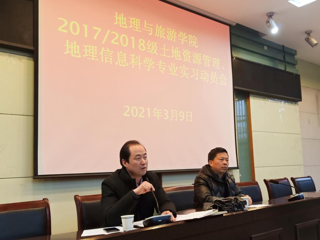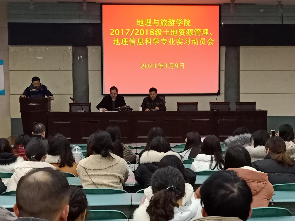 实验楼101召开专业实习动员会。院长曹卫东、院党委副书记乔静,学院专业老师汪左、吴庆双、张运、徐培培、贾蔡、梁栋栋、费罗成、鲁成树、肖瑛、李陈、王满银、罗遥、吴九兴、余健、程久苗、徐玉婷,2018级地理信息科学辅导员彭媛媛参加会议,会议由张运主持,2017、2018级土地资源管理、地理信息科学专业全体同学参与。