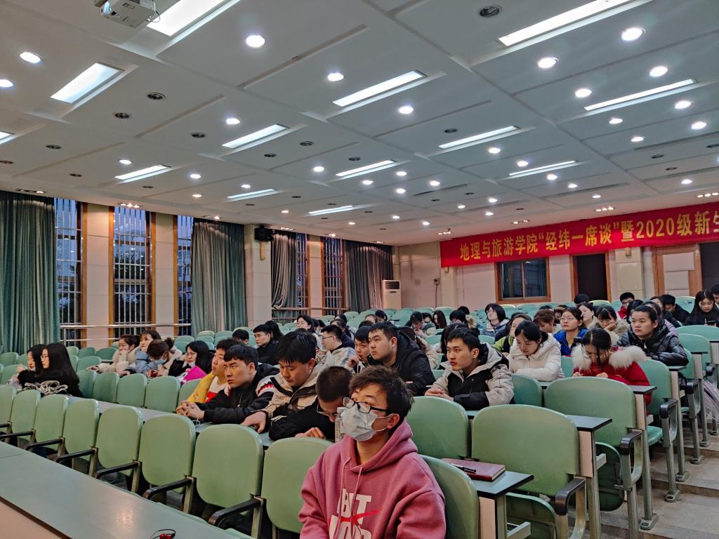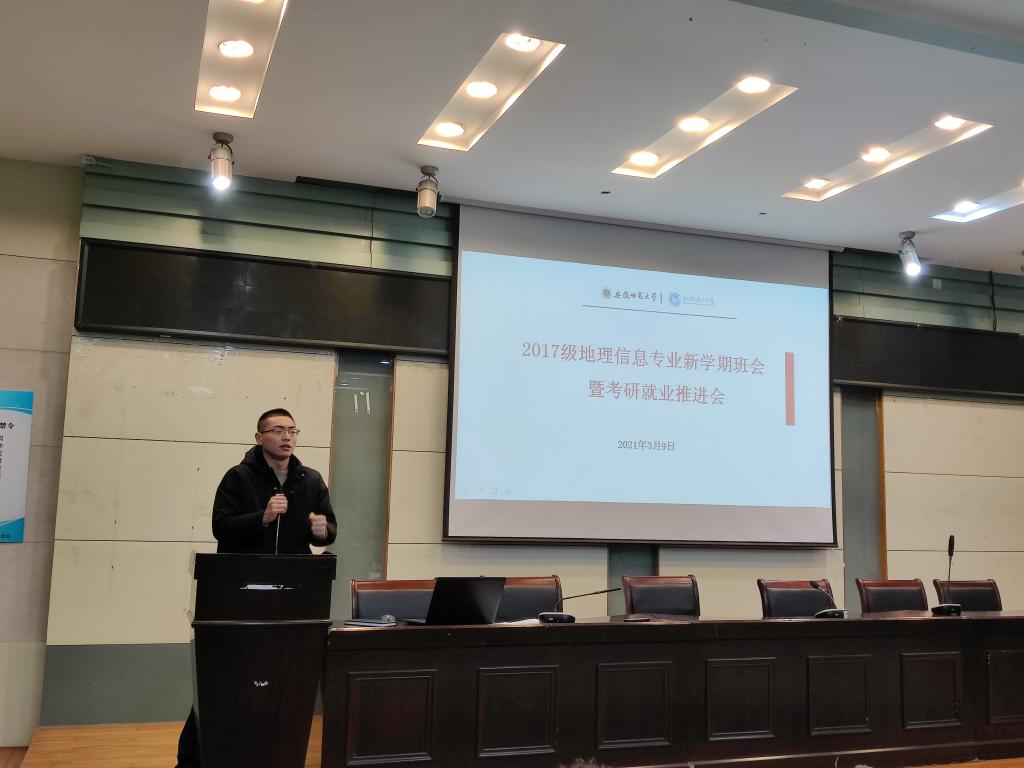 实验楼101报告厅召开了新学期第一次班会暨考研就业推进会。班会由辅导员韩红豆主持,2017级地理信息科学专业全体同学参会。