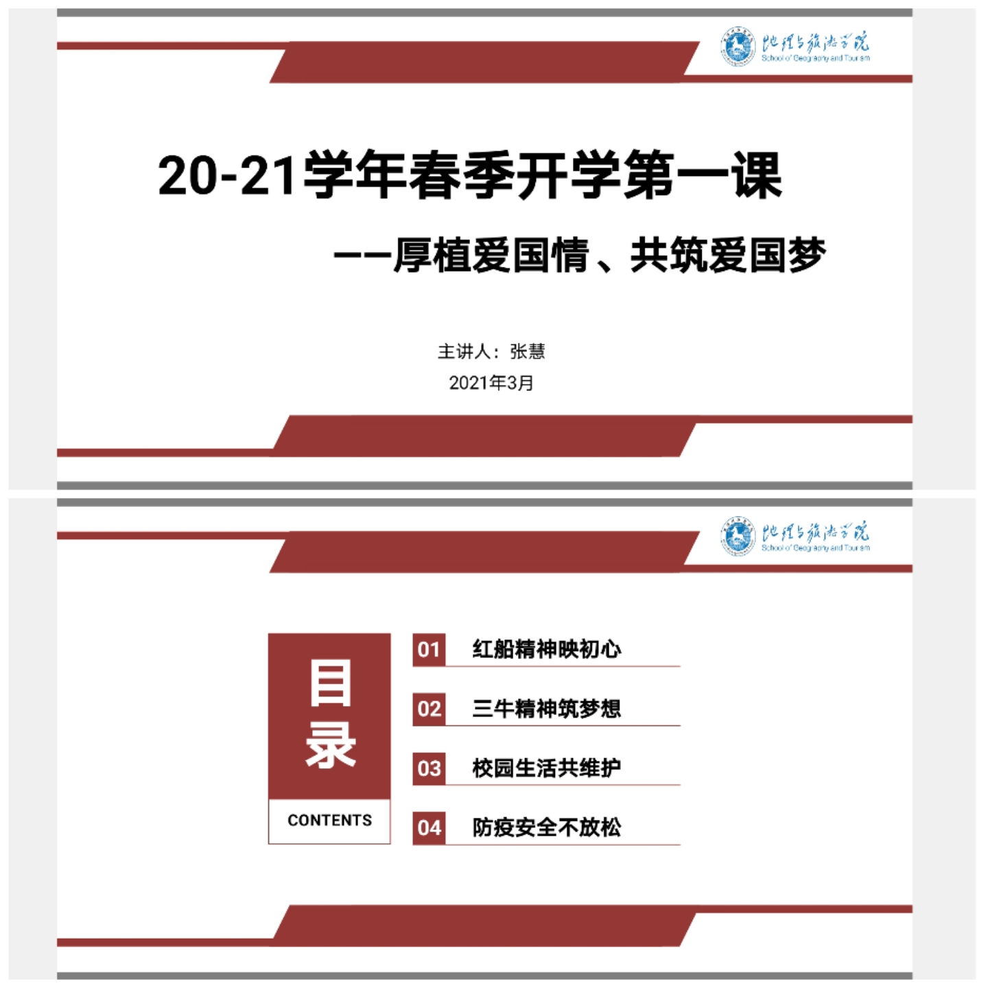 本网讯(张慧 李娜 潘爽)新起点,新征程。为传承红色基因,喜迎建党百年。2021年3月12日晚8点整,2018级城乡规划专业和2018级地理科学(非师范)专业于行知楼2号楼202教室举行名为“厚植爱国情,共筑爱国梦”的主题班会。会议由辅导员张慧主持,2018级城乡规划专业与2018级地理科学(非师范)专业全体同学参与。