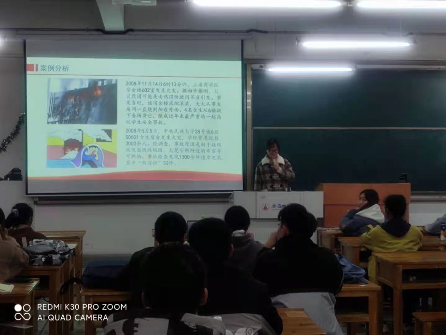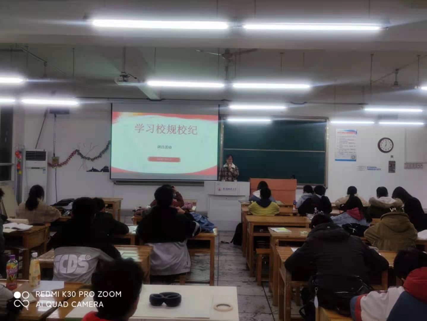 学生管理“四项禁令”:严禁擅自离校、严禁私自租房、严禁晚归不归、严禁违规电器,通过竞答的方式对班级同学进行校规校级知识考核。最后,辅导员刘少杰通过讲述真实案例向大家再次强调认真学习并严格遵守国家法律法规和校规校级的必要性和重要性,并对每位同学提出要求:对于校规校级的学习不仅要内化于心,也要外化于行!