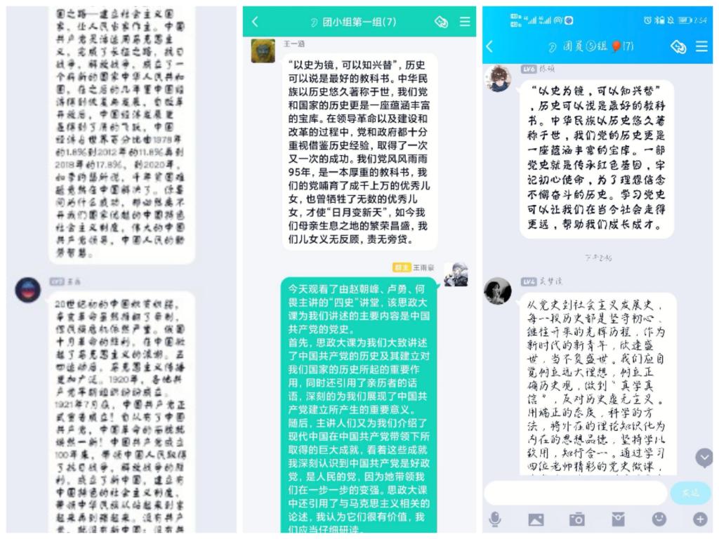 在此次学习活动之前,班级团支部通过各种方式动员大家主动按时观看《四史思政大课》;通过早宣传、多宣传,使同学们对此次活动的重要意义有了深入的了解;通过认真讲、讲清楚,让同学们对此次班级学习活动的目的和必要性有了清晰的认识。在观看过程中,同学们通过“弹幕”激烈讨论:“中国共产党的成立给中国带来了新曙光”,“党执政的正确性毋庸置疑,是历史与人民选择了中国共产党” 。