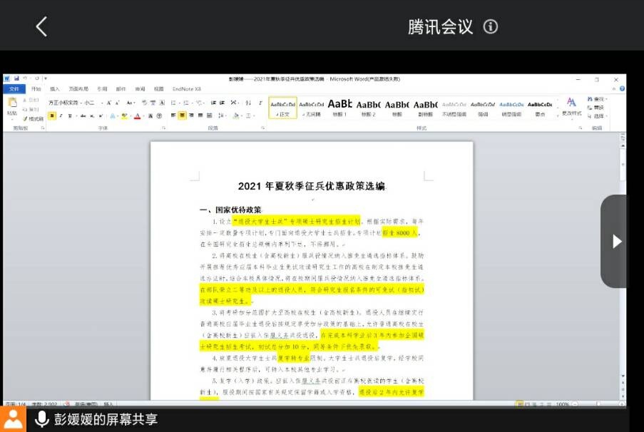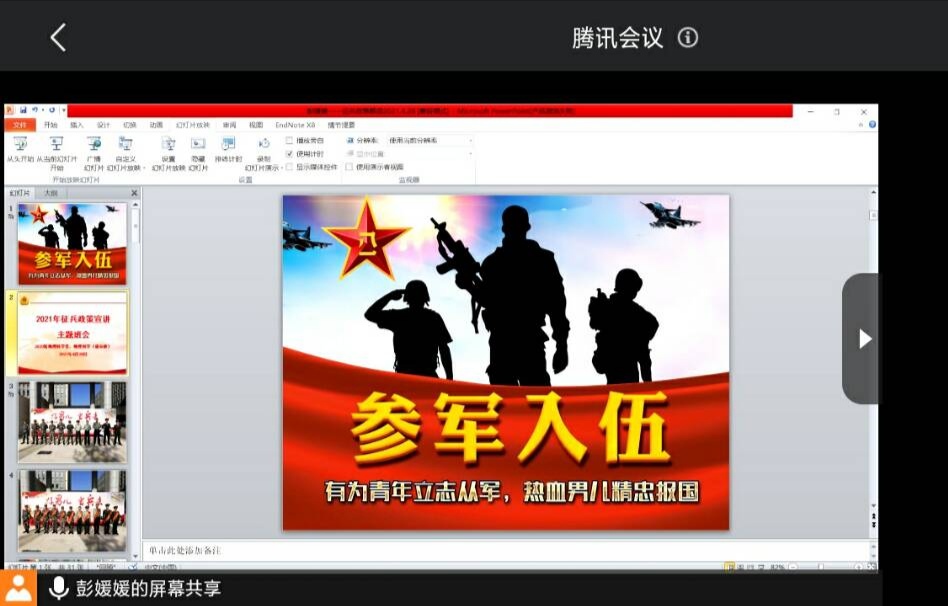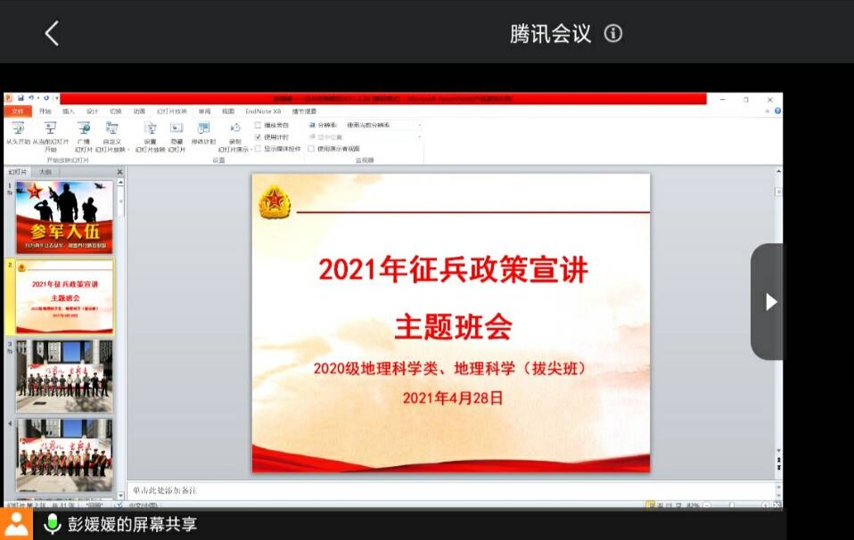 任家俊 彭媛媛)为加强同学们对征兵政策的了解,调动同学们参军报国的积极性,2021年4月28日,2020级地理科学类、地理科学(拔尖班)在腾讯会议平台召开征兵政策宣讲主题班会,会议由辅导员彭媛媛主持,2020级地理科学类、地理科学(拔尖班)全体学生参会。