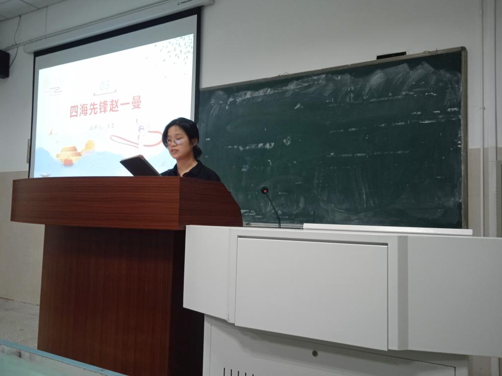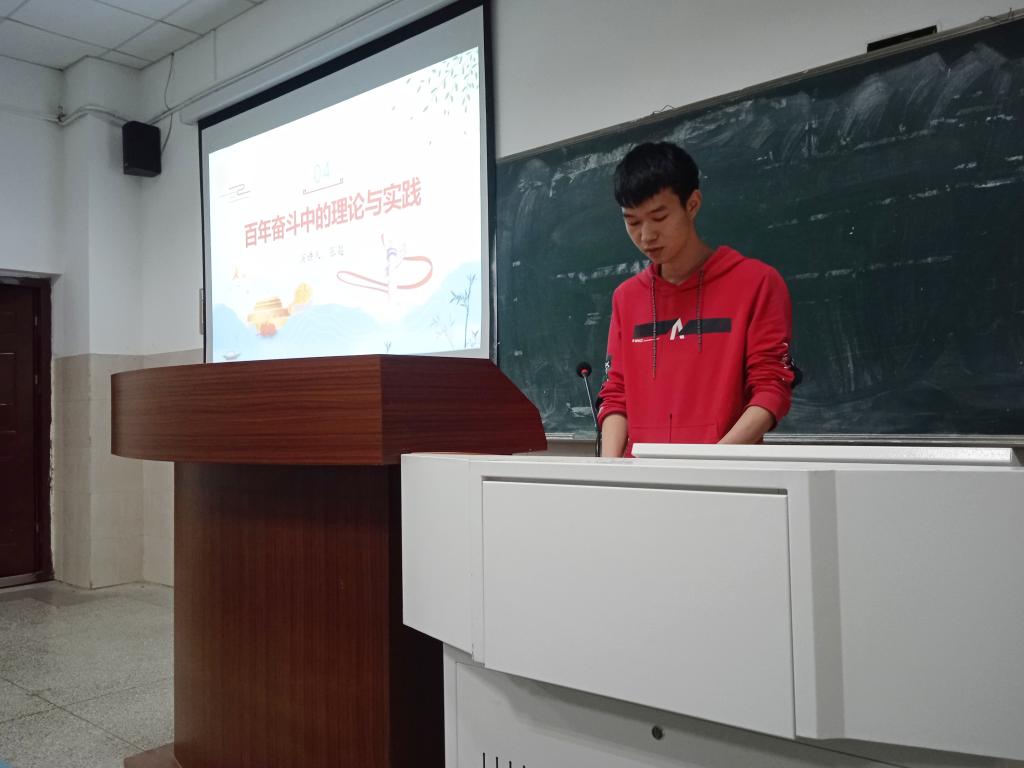 徐露以“不忘初心,砥砺前行”为题,讲述波澜壮阔的百年党史,号召同学们作为新时代的青年,应当树立远大理想,明确人生目标,磨炼本领,砥砺无悔青春。桂万里以“回望苦难辉煌,传承红色精神”为题,带领班级同学回顾党的奋斗、发展和辉煌历程,认识党的正确领导的重要性,坚持中国特色社会主义道路自信、理论自信、制度自信、文化自信。王蕾以“四海先锋赵一曼”为题,结合自身经历与感悟,表达了对英雄人物赵一曼的崇敬之情。张超以“百年复兴中国梦”为题,回顾历史,展望未来,号召同学们做时代的参与者、践行者,为实现伟大复兴中国梦贡献青春力量。陈仁杰以“百年奋斗中的理论与实践”为题,提醒同学们要通过党史学习教育,做到学史明理、学史增信、学史崇德、学史力行,读懂党史中的理论与实践,激发新时代奋斗前行的内生动力。