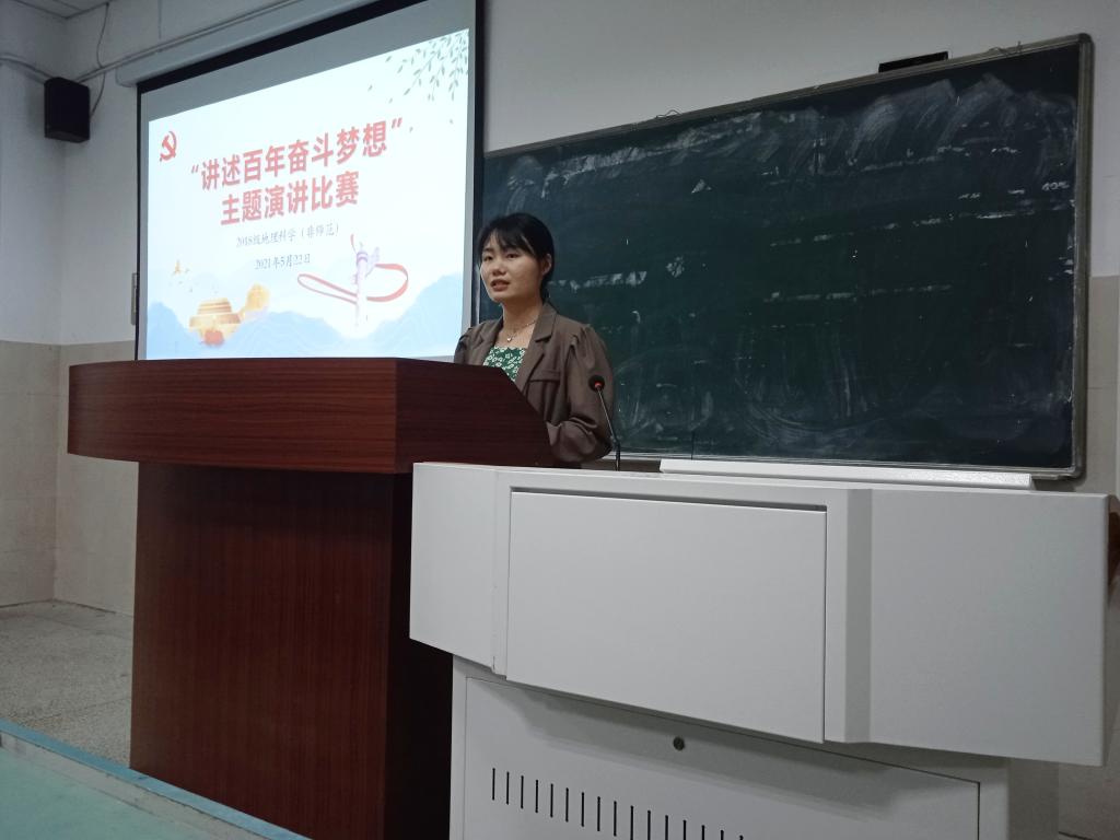李娜)为深入学习百年党史,致敬英雄人物,2021年5月22日晚上七点半,2018级地理科学(非师范)专业“讲述百年奋斗梦想”主题演讲比赛在行知楼4号楼301A教室顺利举行。本次活动由团支书韩雨彤主持,辅导员张慧及2018级地理科学(非师范)专业全体同学参加。