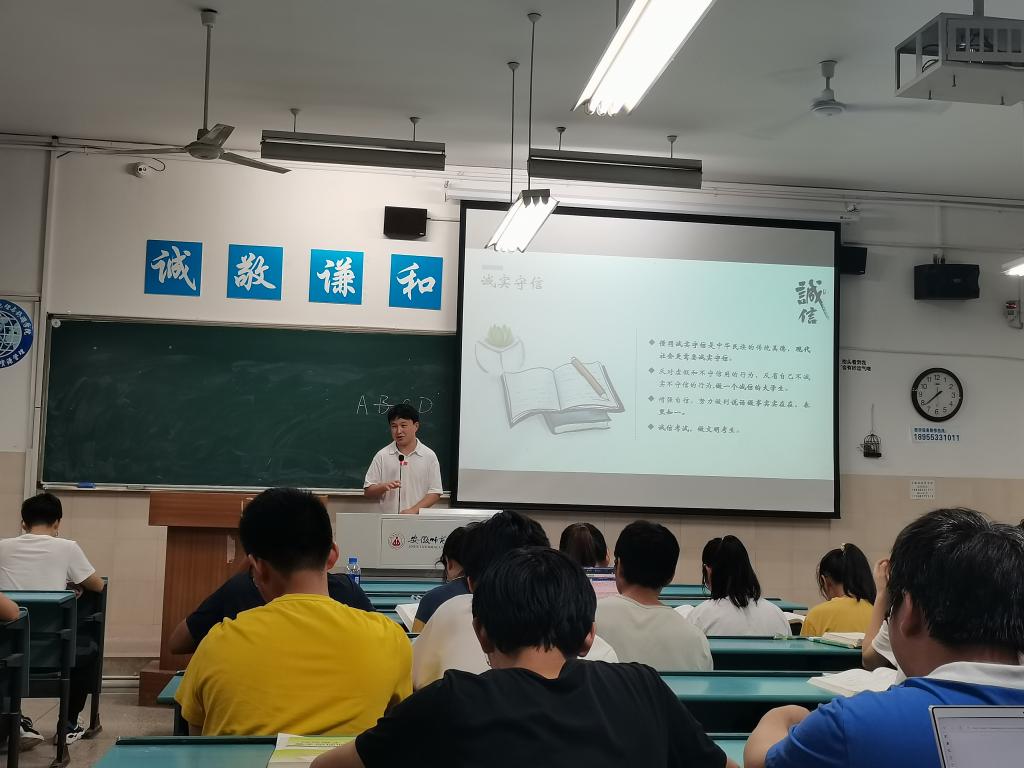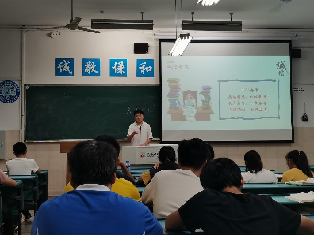 刘少杰以中华传统美德“诚信”为切入点,通过目前大学生面临的诚信危机和国家、学校对失信惩戒的规定,向大家介绍了诚信考试的重要性并呼吁大家养成诚实守信的良好品德。通过身边的真实案例,刘少杰向大家强调了违反考风考纪的严重后果,呼吁大家要严格遵守考风考级。刘少杰向同学们提出了“三点要求”和“两个希望”,即熟悉制度,积极执行;认真复习,积极备考;手握诚信,积极应考;希望大家继续发扬良好的班风,树立起一面积极向上的旗帜;希望人人都能学有所用,学有所长,做一个诚实自信而又有活力的大学生。在动员大家认真复习备考的同时,刘少杰呼吁大家要学会自我减压和心理疏导,保持良好的心态,以积极向上的态度迎接期末考试。