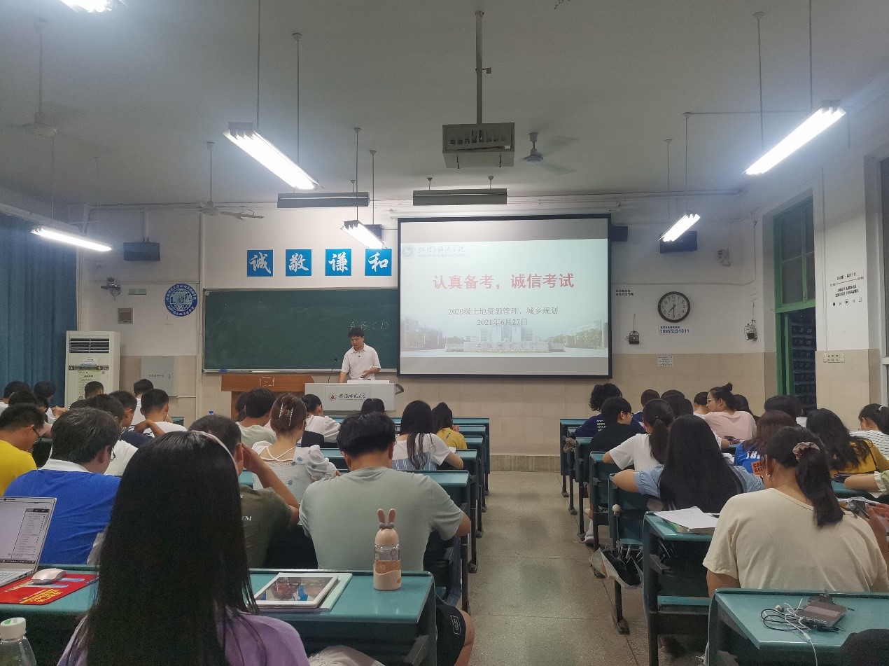 本网讯(刘少杰 耿艺榕)为严肃考纪、端正考风,6月27日晚,20级城乡规划、土地资源管理专业在行知楼召开 “认真备考,诚信考试”主题班会,此次班会由辅导员刘少杰主持,20级城乡规划、土地资源管理专业全体学生参与。