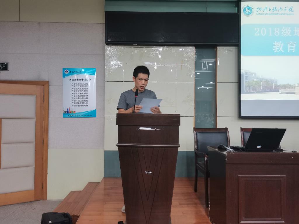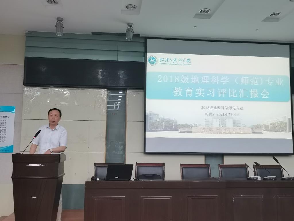 丁茹栩 罗文菁)7月4日下午两点半,2018级地理科学师范专业于地旅实验楼101报告厅举行教育实习评比汇报会,此次会议由辅导员丁茹栩主持,张平究、孙炼、徐仪红、房莉、朱晓强、郦倩玉老师担任评审,实习指导教师焦华富、吴立、孙叶根、汪青、徐光来、杨立辉、胡春生、方叶兵、周迎秋全程指导陪同,2018级地理科学师范专业全体成员参加。