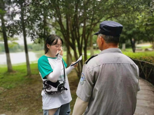 (团队成员在公园采访 张蕾/摄)